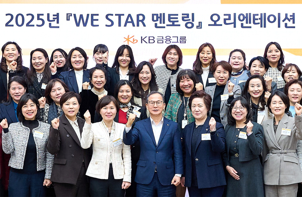 KB금융그룹이 신임 여성 부점장의 리더십 강화를 위해 지난 27일 KB국민은행 일산연수원에서 'WE STAR 멘토링 프로그램' 오리엔테이션을 열었다. 양종희 KB금융그룹 회장(앞줄 가운데)이 신임 여성 부점장 94명과 기념촬영을 하고 있다. KB금융그룹