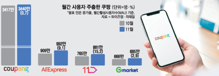 와이즈앱 11월 이용자 통계 블프 등 할인·쇼핑 성수기에 11번가 15%·알리 9% 늘어나 ‘정보유출’ 쿠팡은 0.7% 증가 ‘쿠팡앱만 이용’ 충성고객은 한달새 15만명이나 감소해