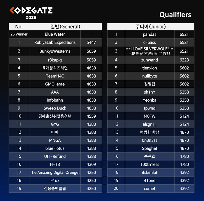 코드게이트 2026 본선 진출팀 명단. 코드게이트. 세계 3대 국제 해킹방어대회로 꼽히는 ‘코드게이트 2026’ 예선전이 종료됐다. 인공지능(AI) 시대를 맞아 보안 위협이 고도화하는 가운데 전 세계 88개국 화이트해커 3333명이 몰리며 최근 3년 사이 최대 규모를 기록했다.