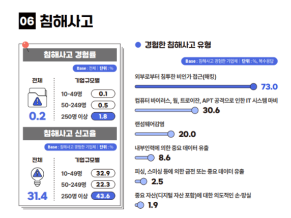 2025 정보보호 실태조사 중 기업들의 침해사고 경험률 및 신고율 [출처 = 과학기술정보통신부] 사이버 침해사고를 겪은 기업 중 31.4%만이 관련기관 또는 수사기관에 피해 사실을 신고하는 것으로 나타났다.