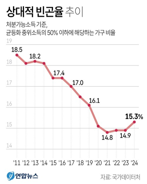 국가데이터처가 30일 발간한 ‘한국의 SDG(지속가능발전목표) 이행현황 2026’ 보고서에 따르면 2024년 기준 상대적 빈곤율은 15.3%로 전년보다 0.4%포인트 상승했다. 2019년 이후 5년 만에 가장 높은 수준으로,소득 중위값의 50%에 못 미치는 인구가 100명 중 15명 이상이라는 의미다. 2011년 이후 하락하던 흐름에서 벗어나 큰 폭으로 반등했다.
