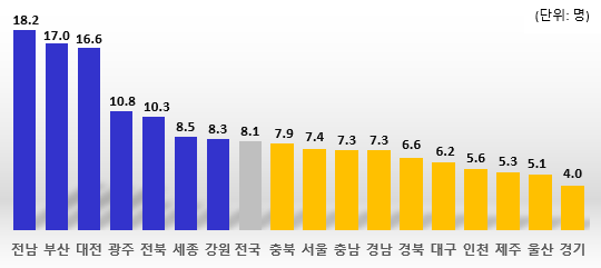 시도별 65세 이상 노인인구 1만 명당 신청현황을 살펴보면,전남이 18.2명으로 가장 많았고 부산 17.0명,대전 16.6명,광주 10.8명,전북 10.3명 순이었다. 시군구별로는 부산 중구,전북 무주군,전남 담양군,광주 동구,전남 순천시 등의 노인인구 대비 신청자 비중이 높았다.