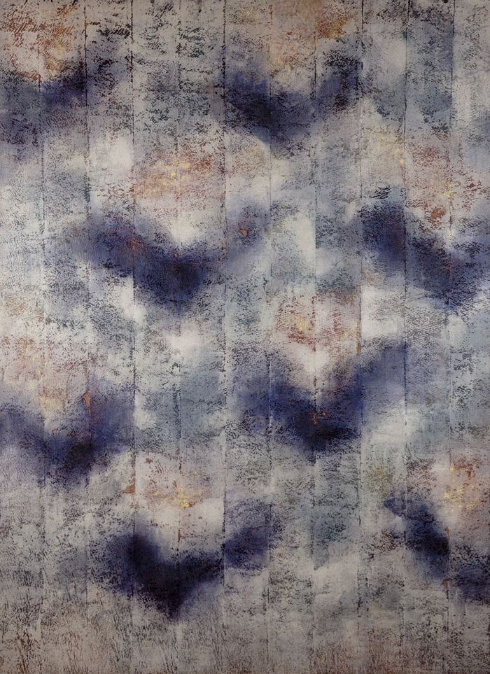 방혜자의 ‘하늘의 땅’(2011) <국립현대미술관 이건희컬렉션> 빛을 표현한 원형 작업이 특히 눈길을 끈다. 작가는 닥종이를 고깔 모양으로 구겨 주름을 만들고 이를 펼쳐 먹으로 원형을 그렸다. 이후 종이의 결을 따라 붓질했다. 튀어나온 부분에 색이 입혀지고 패인 부분에는 여백이 남는다. 여기에 아크릴,천연안료,유화 등을 여러 겹 쌓아 올렸다. 뒷면에 색을 입혀 앞면에 은은하게 스미게 하는 동양화의 배체법을 더해 독특한 마티에르를 완성했다. 빛이 반짝이듯 아름다운 색채가 깊이 있는 화면에서 피어오른다.