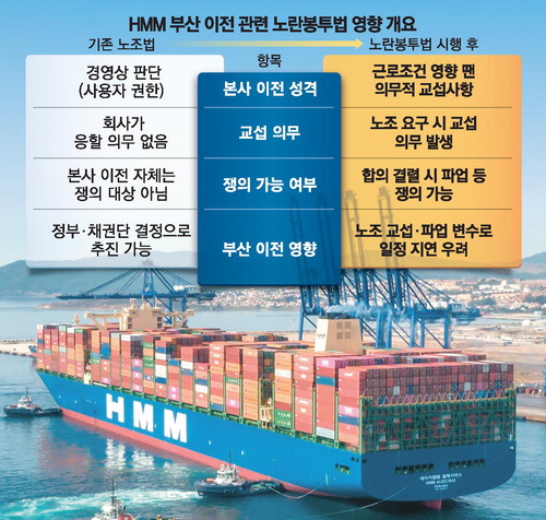 이재명 정부의 '부산 해양수도' 핵심 공약인 HMM 부산 이전이 정부 스스로 밀어붙인 친노조 입법과 정면충돌하는 모순에 직면했다. 이번 정부 들어 통과된 이른바 노란봉투법(노동조합법 2·3조 개정)으로 본사 이전 같은 경영상 결정까지 노동쟁의 대상에 포함되면서 이전과 매각 추진안의 법적 불확실성이 커졌다는 지적이다.