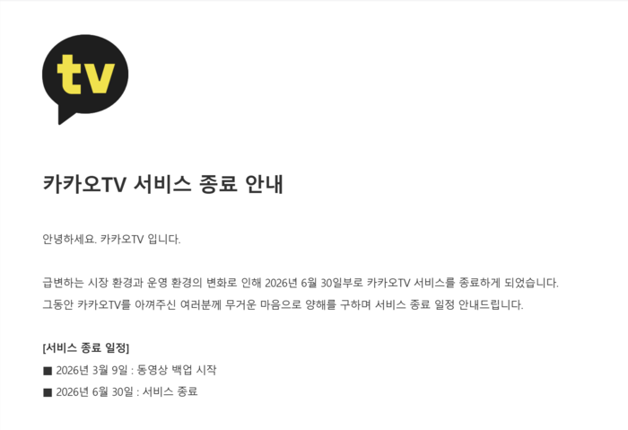 이날 이용자들에게 전달한 공지에서 카카오TV는 “급변하는 시장 환경과 운영 환경의 변화로 인해 서비스 를 종료하게 됐다”고 설명했다.