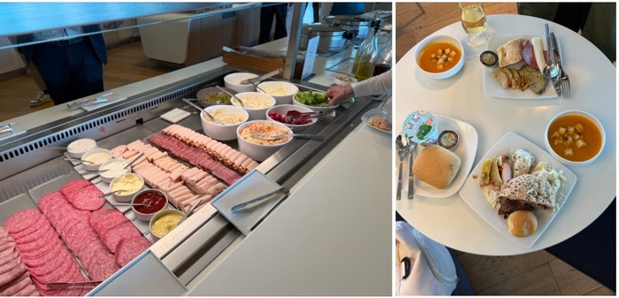 에어프랑스 라운지에서 제공하는 음식. /사진= 강예신 기자 ​‘미식의 나라’답게 베이커리와 유제품의 퀄리티가 돋보였다. 갓 구워낸 바삭한 빵과 풍미 깊은 버터,신선한 햄과 치즈의 조합은 프랑스 라운지에서만 가능한 경험이었다.