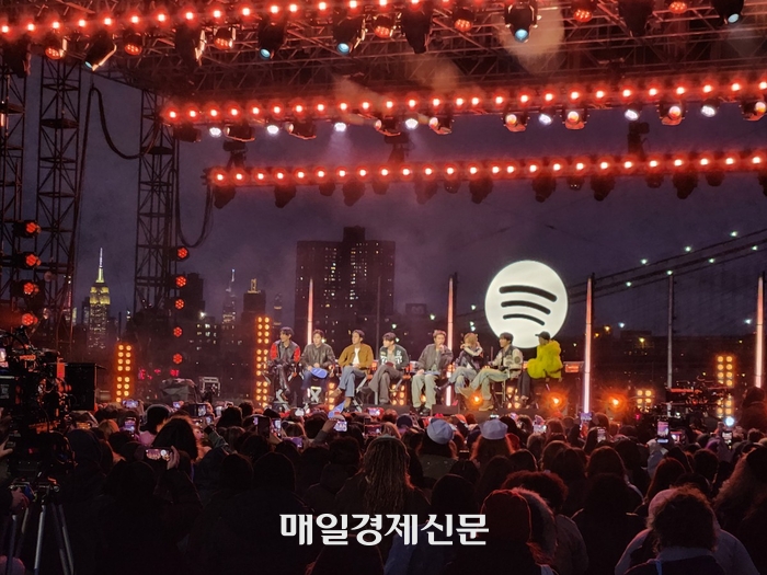 그룹 BTS가 23일(현지시간) 미국 뉴욕 맨해튼에 위치한 피어 17 루프탑에서 아미(공식 팬덤)를 위한 특별 행사인 ‘스포티파이 X BTS : 스윔사이드’를 개최했다. 멤버 좌측으로 뉴욕의 상징 ‘엠파이어 스테이트 빌딩’이 보인다. <길금희 기자> BTS는 신규 5집 앨범 ‘아리랑’(ARIRANG)의 타이틀곡 ‘스윔’(SWIM)을 비롯해 ‘노멀’(NORMAL)‘,‘FYP’ 등 신곡 무대를 선보였다.
