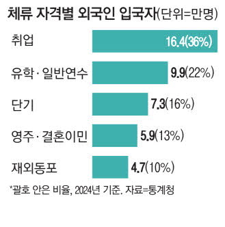 체류 자격별로는 취업 목적이 36.4%로 가장 많았다. 이어 유학·연수(21.9%),단기 체류(16.1%),영주·결혼이민(13.1%) 순이었다.