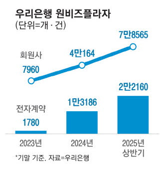 이날 우리은행 측은 중소기업의 경영상 난관을 풀어줄 수 있는 다양한 플랫폼을 공개했다. 대표 서비스는 2022년 처음으로 선보인 원비즈플라자다. 이 서비스는 구매 요청부터 견적과 입찰,발주와 검수까지 표준 구매 프로세스 전체 기능을 무상으로 제공한다. 원비즈플라자를 통하면 텍스트를 복붙(복사해서 붙여넣기)하는 것만으로도 전자 계약 형식을 갖출 수 있어 편리하다는 평가다. 회원사는 작년 말 4만여 개에서 올해 상반기 7만8000여 개로 증가했다.