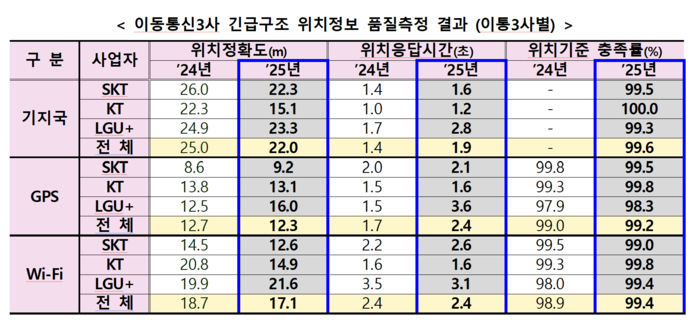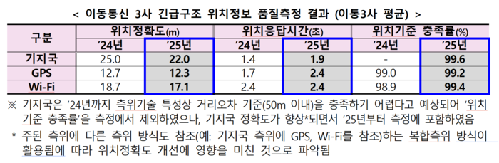 그 결과 이통 3사 평균 기준 기지국 방식 위치정확도는 2024년 25.0m에서 2025년 22.0m로 개선됐고,위치기준 충족률은 99.6%를 기록했다. 상대적으로 응답시간은 1.4초에서 1.9초로 다소 늘어났다.