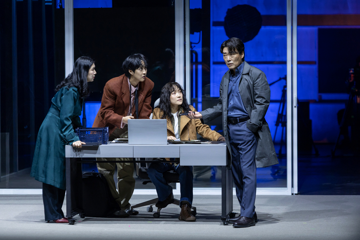 연극 ‘빅 마더’에서 거대한 대중 여론 조작 알고리즘의 뒤를 캐는 ‘뉴욕 탐사’ 소속 기자들의 모습. 세종문화회관 100분 동안 58개의 장면이 쉴 새 없이 몰아친다. 유튜브 쇼츠를 방불케 하는 빠른 전개로 알고리즘과 인공지능(AI)이 진실을 위협하는 미디어 환경을 다룬 프랑스 연극 ‘빅 마더’가 지난 30일 세종문화회관 M씨어터에서 막을 올렸다.